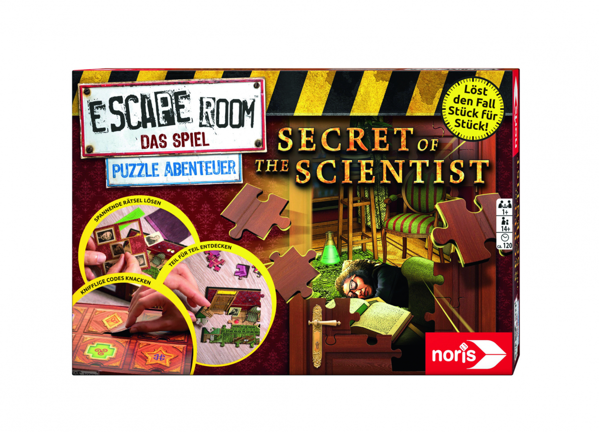 Escape Room Das Spiel – „Puzzle Abenteuer“ von Noris-Spiele ist die geniale Kombination eines klassischen Escape Room- Abenteuers in Verbindung mit verschiedenen Puzzleteilen, die in der richtigen Reihenfolge zusammengesetzt werden müssen. „Secret of the scientist“, zu Deutsch „Das Rätsel um die Wissenschaftlerin“, ist für Spieler ab 14 Jahren geeignet und kann in etwa 120 Minuten gelöst werden.